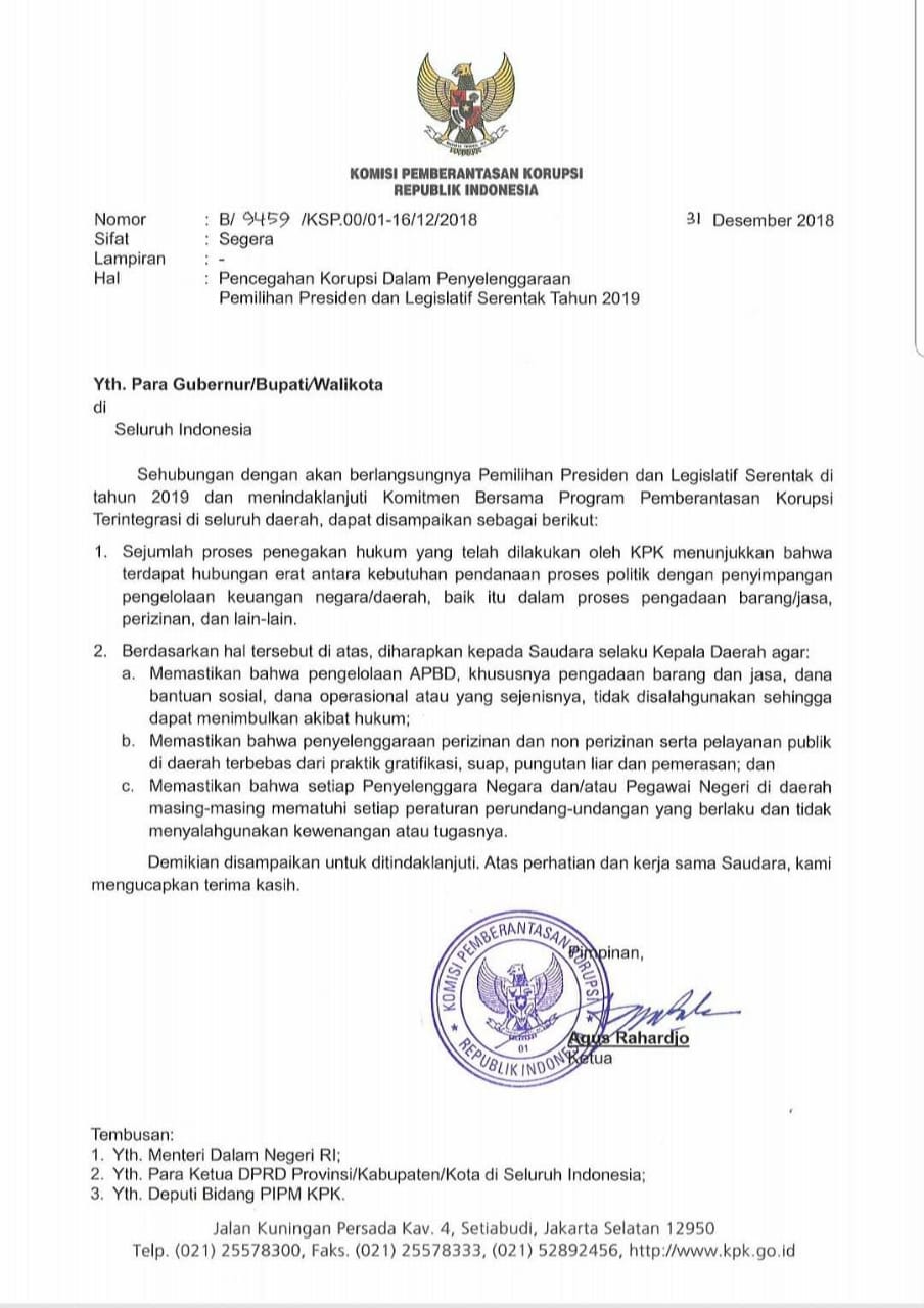 Secara garis besar, surat KPK untuk Kepala Daerah tersebut memberikan warning akan adanya praktik penyalahgunaan antara kebutuhan pendanaan proses politik dengan penyimpangan pengelolaan keuangan negara/daerah, baik itu dalam proses pengadaan barang/jasa pemerintah, perizinan, dan lain-lain.