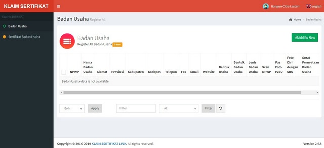 3. Kemudian pilih menu Sertifikat Badan Usaha, untuk mulai input dan upload SBU yang akan dijadikan SBU digital.
